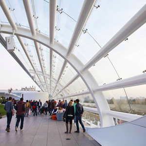 The underlying principle is simple: holes are drilled in the panes of glass,which are then attached directly to a load-bearing structure using specially designed metal fittings. The joins between the panes of glass are sealed with a UV-resistant silicone.