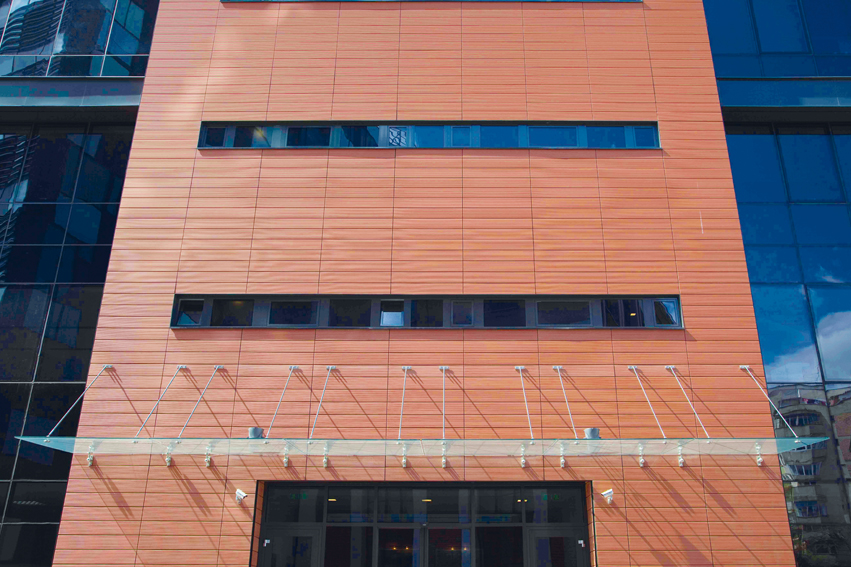 The system consists of a subframe and a finishing (ceramic tiles, granite, natural stone, high-pressure laminates, composite aluminium panels, metal panels (aluminum, steel), fibre-cement board, or durable exterior woods). This cladding type uses an outer layer to keep out the rain and an inner layer to provide thermal insulation, prevent excessive air leakage and carry own and wind loading. The outer layer breathes like a skin while the inner layer reduces energy losses.